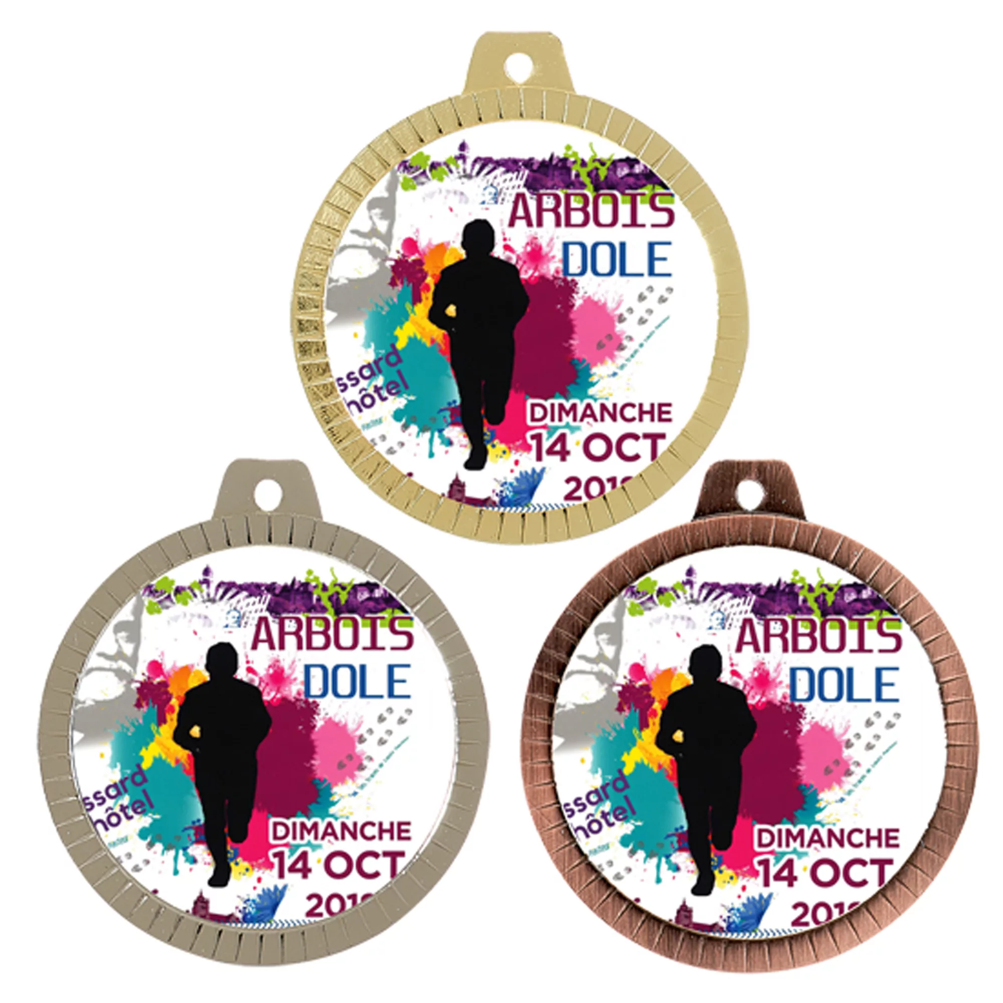 Médaille personnalisable de 70 mm idéale pour compétitions et événements. Disponible en finitions or, argent et bronze pour respecter la tradition du podium.