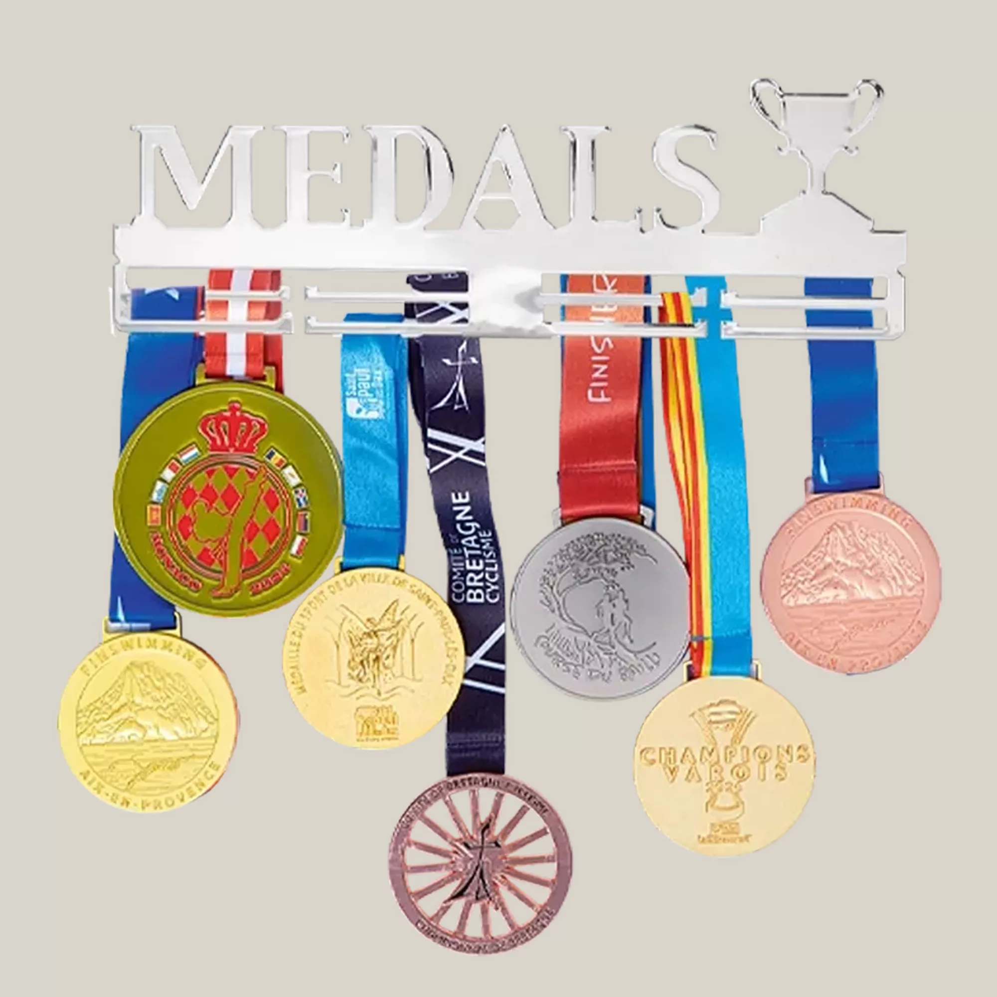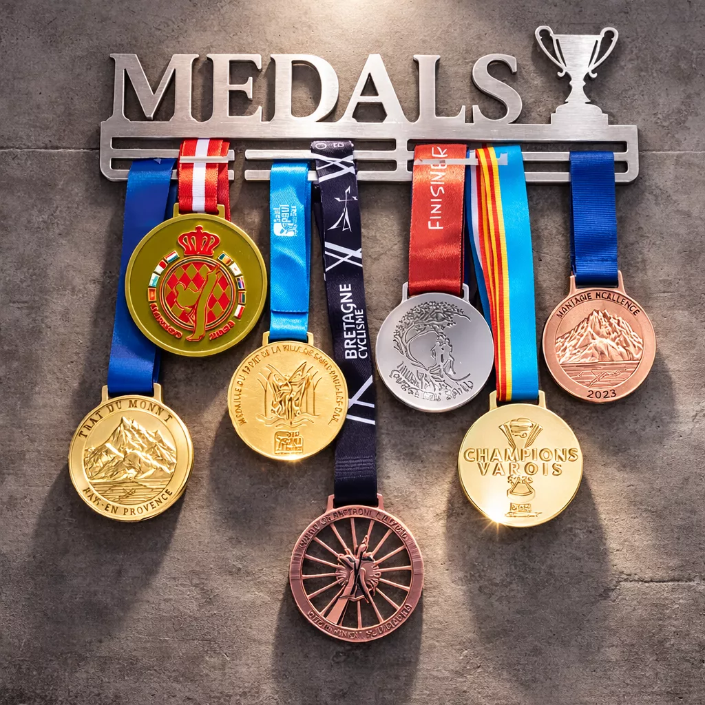 Support mural porte-médailles avec inscription « Medals », conçu pour exposer et organiser un grand nombre de récompenses sportives. Solide et décoratif, il met en valeur chaque victoire avec élégance.